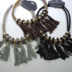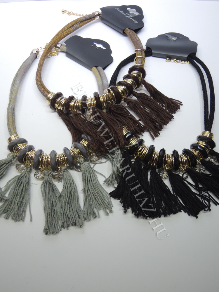 Zsinórból,nyaki részen rojttal,fém és műanyag elemekkel valamint csiszolt üveggyöngyökkel készült,állítható méretű nyaklánc.
