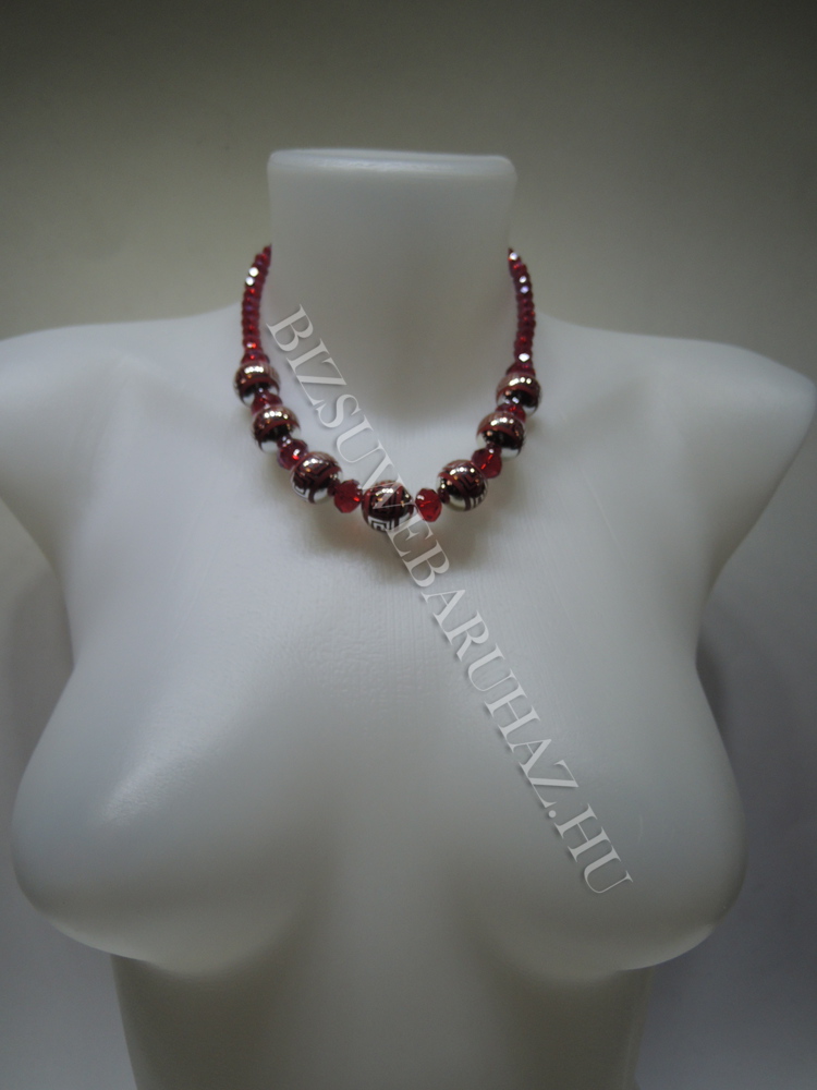 Csiszolt kövekből készült nyaki részen fém elemekkel díszített állítható méretű nyaklánc.