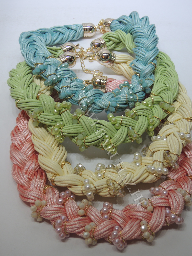 Zsinórból készült,fonott hatású,nyaki részen gyöngyökkel díszített,állítható méretű nyaklánc.