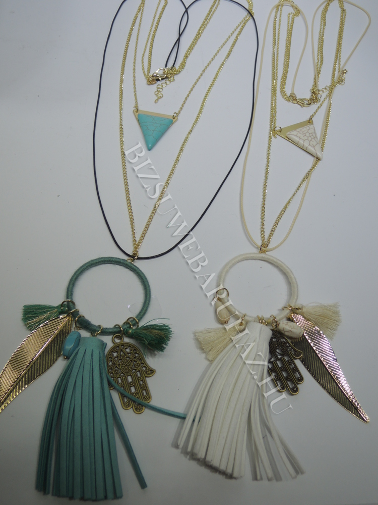 Antiallergén fém bevonattal készült,fém levéllel,bőr rojttal,csiszolt műanyag kövekkel illetve fém fatima keze medállal díszített állítható méretű nyaklánc.