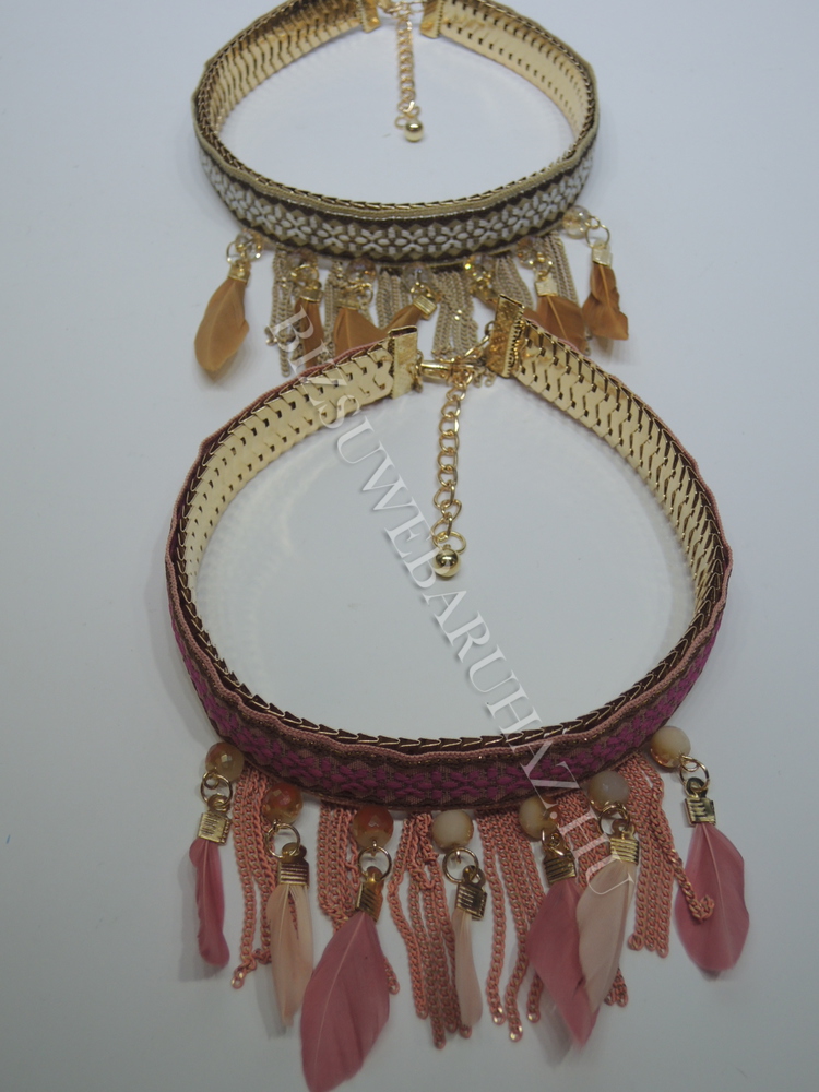 Antiallergén fém bevonattal készült,külső részén textil bevonatos,állítható méretű nyakpánt,csiszolt kövekkel ,tollakkal és láncokkal díszítve.