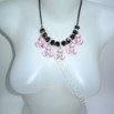 Nyaki részen zsinórokból,teklagyöngyökkel és üvegkövekkel díszített állítható méretű nyaklánc.